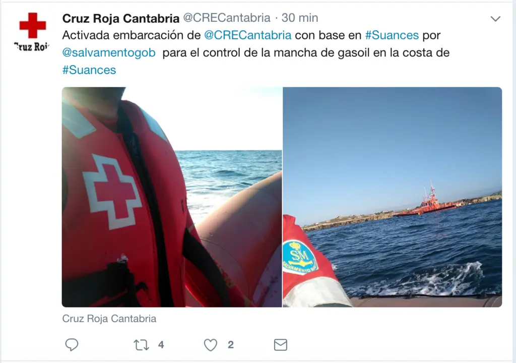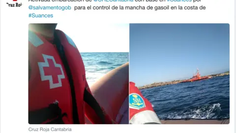 La embarcación de Cruz Roja Cantabria con sede en Suances era activada en la tarde de hoy, domingo, por Salvamento Marítimo para colaborar en el control de la "mancha" de gasóil frente a la costa suancina. Así lo informaban desde Cruz Roja Cantabria.