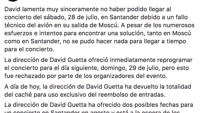 photo photo_camera Cantabria Guetta asegura haber devuelto todo el dinero del caché para el reembolso de las entradas del concierto