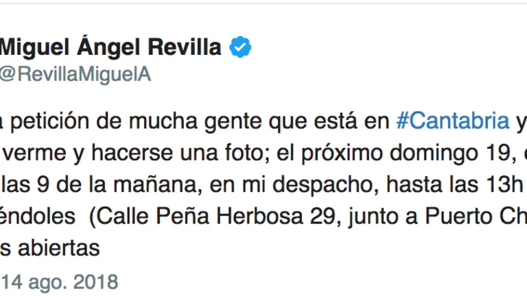 photo photo_camera Cantabria Revilla anuncia que recibirá a quien quieran ir a verle y las redes le ovacionan, "mas políticos como tu hacen falta"