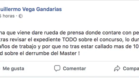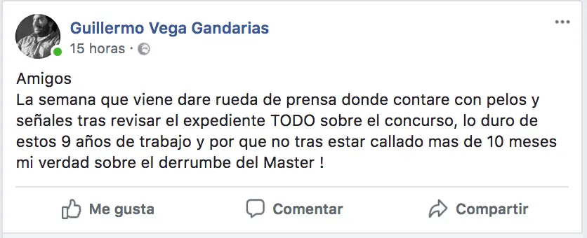 "La semana que viene dare rueda de prensa donde contare con pelos y señales tras revisar el expediente TODO sobre el concurso, lo duro de estos 9 años de trabajo y por que no tras estar callado mas de 10 meses mi verdad sobre el derrumbe del Master"
