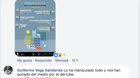 El gerente de Mouro Producciones, Guillermo Vega, anunciaba ayer a través de sus redes sociales una rueda de prensa para hablar sobre el concurso público de adjudicación de los conciertos así como de los sucedido con el derrumbe de la calle Sol en Santander (El mismo era uno de los socios de que iba a ser el nuevo Bar Master), motivo por el que, según él, le han 'quitado', la adjudicación.