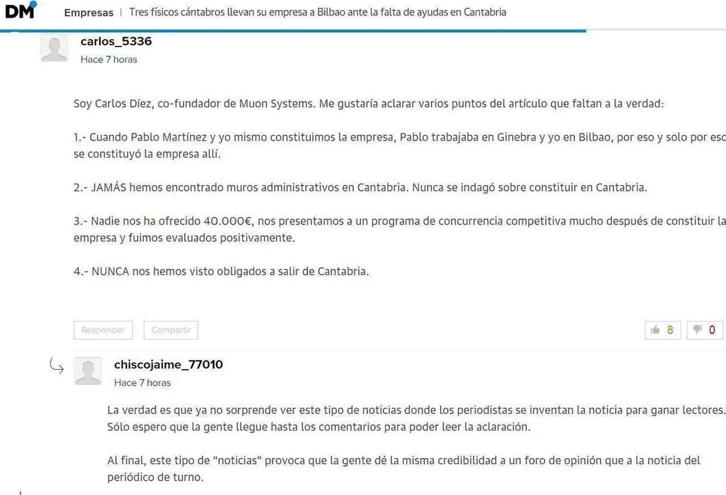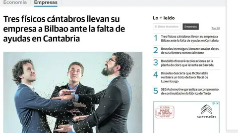 El titular del día, "Tres físicos cántabros llevan su empresa a Bilbao por falta de ayudas en Cantabria", este era el desayuno periodístico en El Diario Montañes este jueves, pues bien, uno de sus fundadores desmiente esta información sobre la propia noticia del periódico.