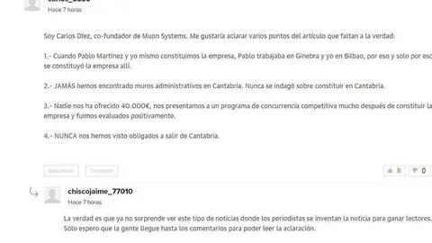 Prosigue otro de los usuarios:La información que se da en este artículo no tiene nada que ver con la realidad. Carlos Díez, socio fundador junto con Pablo Martínez, vive en Bilbao desde 2009, 6 años antes de que se fundara la empresa. Fue él quien se encargó de fundar la empresa a nivel administrativo mientras Pablo Martínez vivía en Suiza y por supuesto lo hizo en su lugar de residencia sin indagar nunca en qué condiciones podría hacerlo en Cantabria. Es decir, nunca se valoró la opción de constituir la empresa en Cantabria.