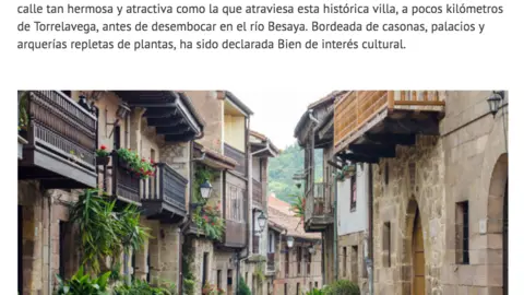"Es difícil encontrar en todo Cantabria, ya de por sí repleta de bellísimas poblaciones, una calle tan hermosa y atractiva como la que atraviesa esta histórica villa, a pocos kilómetros de Torrelavega, antes de desembocar en el río Besaya. Bordeada de casonas, palacios y arquerías repletas de plantas, ha sido declarada Bien de interés cultural."
