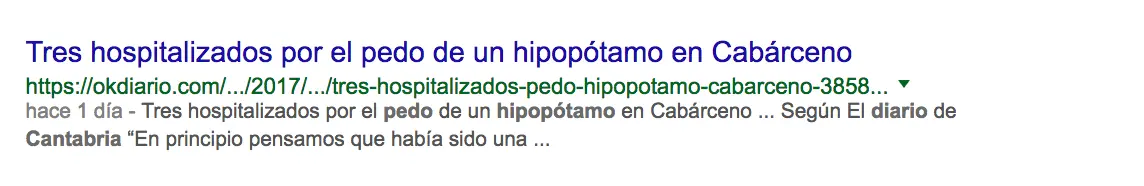 La historia contaba que tres ancianos que estaban de visita en el Parque de la Naturaleza de Cabárceno, en Cantabria, se vieron sorprendidos por la toxicidad de los gases que desprendió la flatulencia de un hipopótamo. La falsa noticia relataba que varios de ellos habían caído fulminados y que habían requerido la asistencia de los servicios de emergencia.