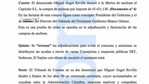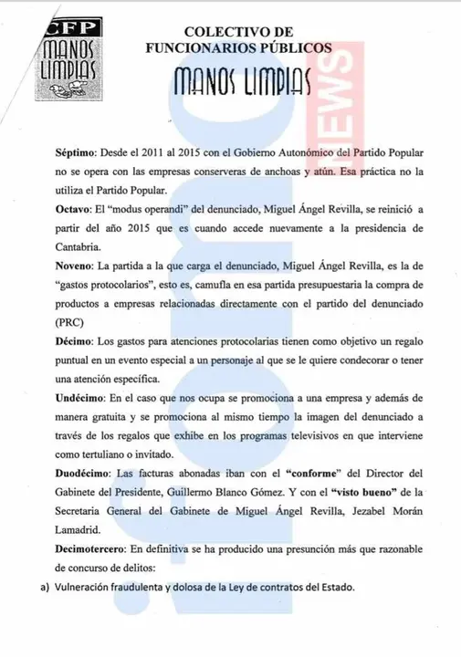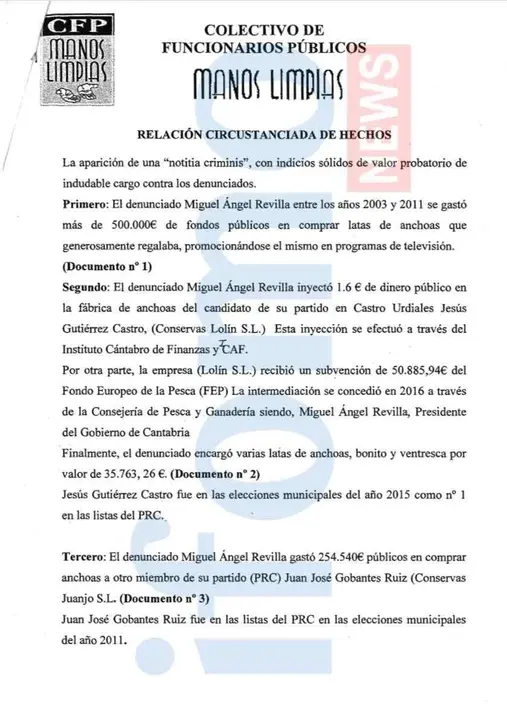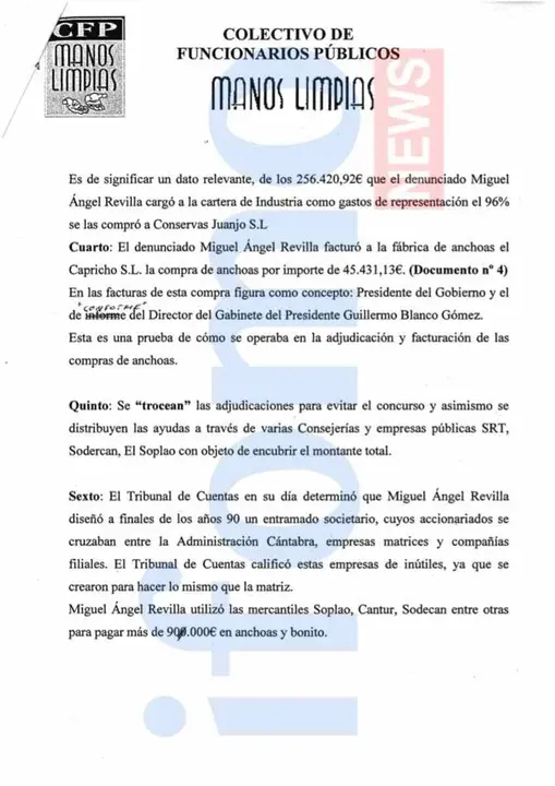 El sindicato de funcionarios públicos Manos Limpias presentó el pasado día 9 de Octubre una escrito en la Fiscalía de Madrid denunciando el gasto de 500.000 euros entre los años 2003 y 2011 del Presidente Miguel Ángel Revilla en anchoas cántabras, justificado como gastos de representación de las diferentes consejerías regionales.