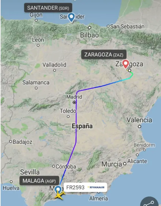 El vuelo debía despegar a las 18:55h aunque finalmente ha salido a las 19:16horas y a su paso por Madrid ha sido directamente desviado hacia Zaragoza, tras dejar al pasaje el avión regresaba a Málaga vacío.