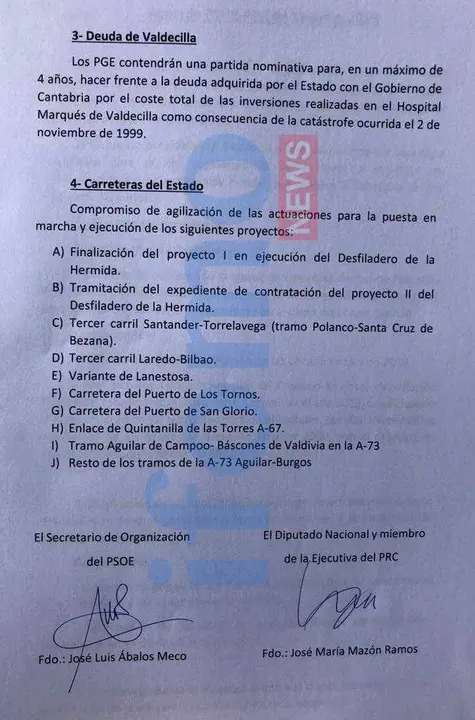 Este medio ha tenido acceso al documento que han firmado el Diputado Nacional del PRC, Jose María Mazón y el Ministro de Fomento en funciones y Secretario de Organización del PSOE, Jose Luis Ábalos.