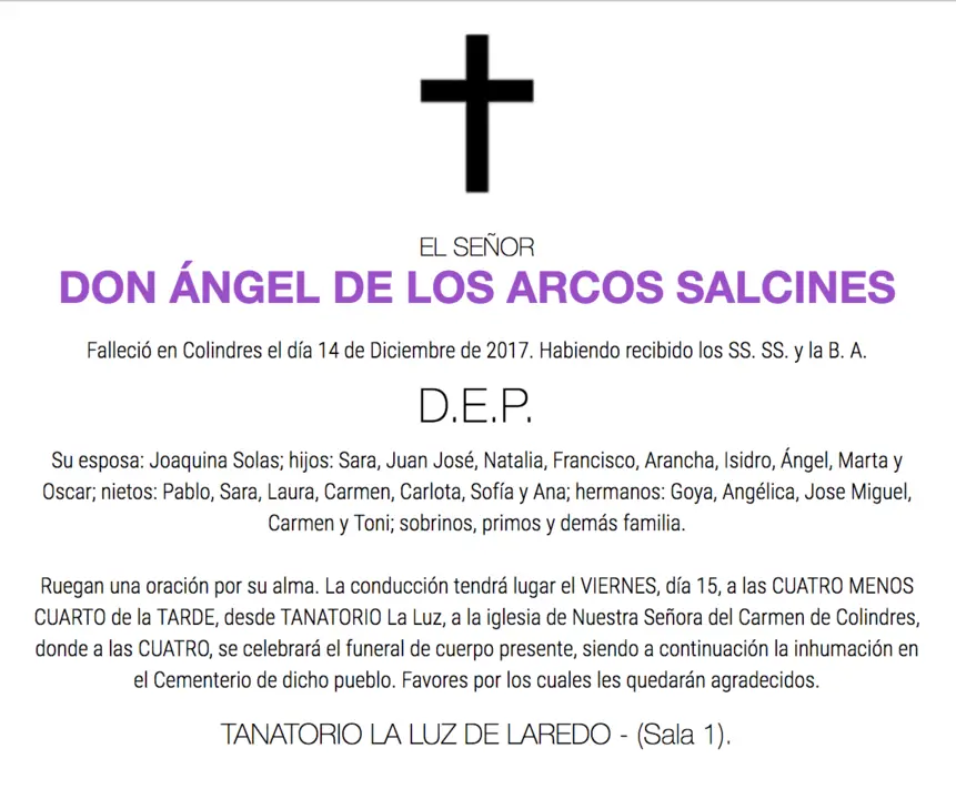 El mundo del motor y la empresa familiar esta de luto hoy en Cantabria, el Señor Ángel de los Arcos Salcines ha fallecido en Colindres en la mañana de hoy rodeado de su familia.