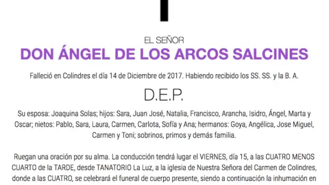 La conducción tendrá lugar el Viernes día 15 a las cuatro menos cuarto desde el Tanatorio La Luz hasta la iglesia Nuestra Señora del Carmen de Colindres donde a las cuatro se celebrará el funeral de cuerpo presente.