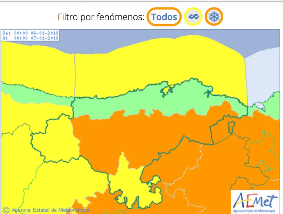 Mientras que el aviso por riesgo de nevadas estará activo desde las 12.00 horas de este viernes y hasta las 00.00 horas del sábado, y afectará a Cantabria del Ebro y la comarca de Liébana.