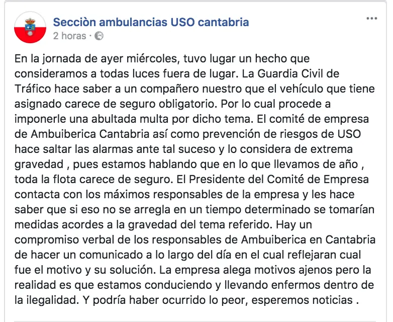 USO Cantabria en su sección de ambulancias emitía una comunicación en la mañana de hoy alertando ante la multa que un conductor de ambulancia de la empresa Ambuíberica (Empresa encargada del transporte sanitario regional) ha recibido ayer por circular con su ambulancia sin el seguro obligatorio.
