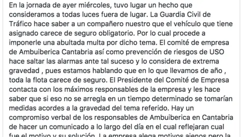 Hay un compromiso verbal de los responsables de Ambuiberica en Cantabria de hacer un comunicado a lo largo del día en el cual reflejaran cual fue el motivo y su solución. La empresa alega motivos ajenos pero la realidad es que estamos conduciendo y llevando enfermos dentro de la ilegalidad. Y podría haber ocurrido lo peor, esperemos noticias."