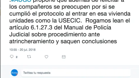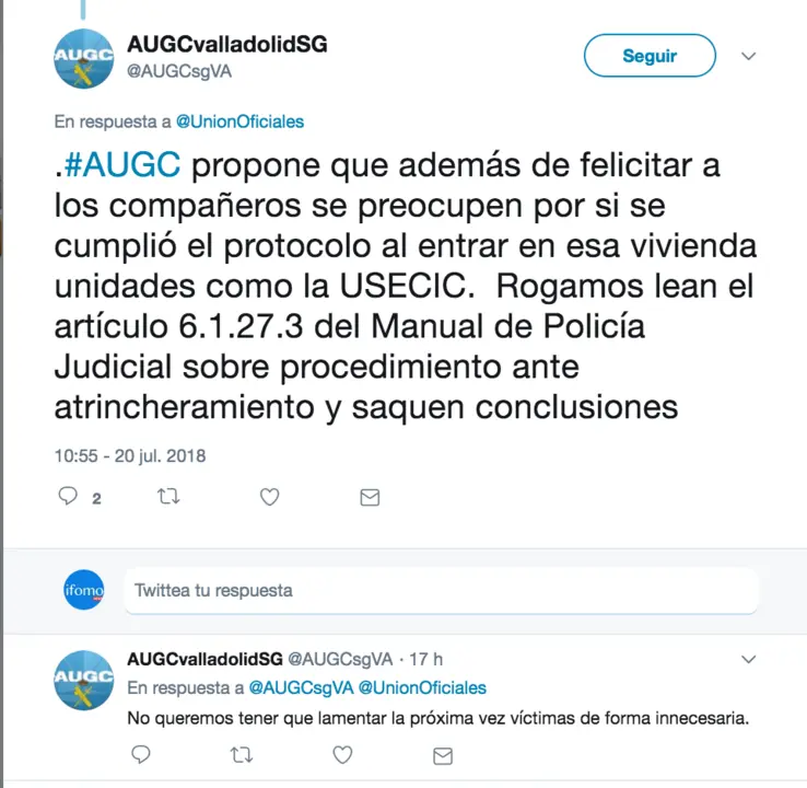 La segunda respondía al tweet con este: "- #AUGC propone que además de felicitar a los compañeros se preocupen por si se cumplió el protocolo al entrar en esa vivienda unidades como la USECIC. Rogamos lean el artículo 6.1.27.3 del Manual de Policía Judicial sobre procedimiento ante atrincheramiento y saquen conclusiones. No queremos tener que lamentar la próxima vez víctimas de forma innecesaria."