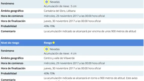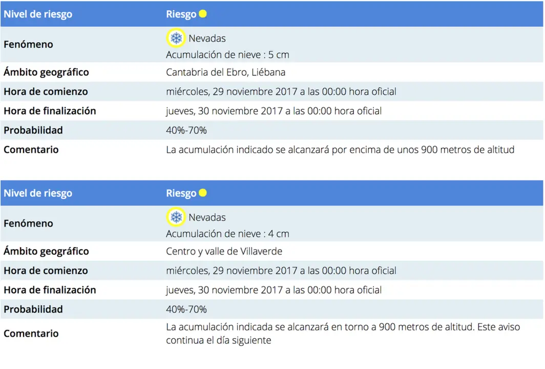 En concreto, este aviso por riesgo de nieve se activará en Cantabria del Ebro, la comarca de Liébana, el centro regional y el Valle de Villaverde.