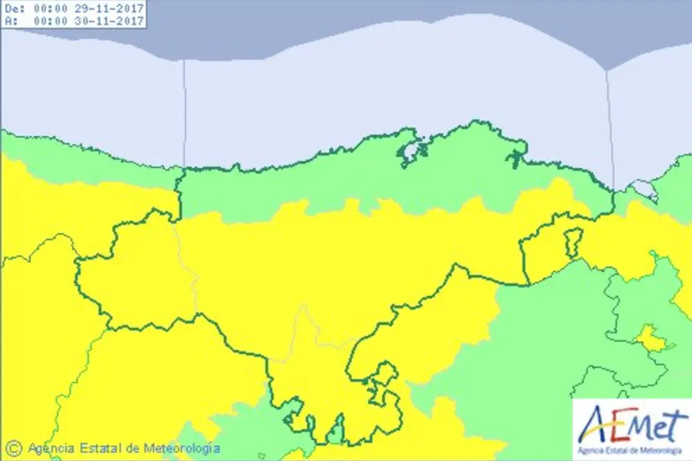 El aviso permanecerá activo desde las 00.00 horas de este miércoles hasta la misma hora del jueves, día 30, periodo durante el cual se prevé que la cota de nieve se sitúe en los 900 metros.