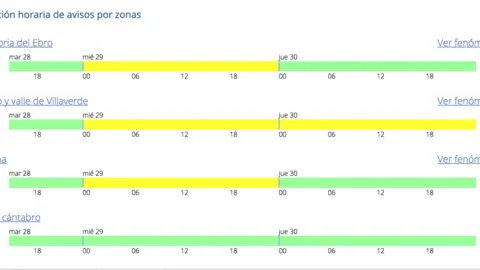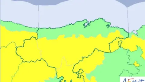 Estas cuatro también estarán en aviso por heladas, mientras que en Girona se ha decretado aviso amarillo por bajas temperaturas y oleaje. En riesgo de heladas están Cantabria, Navarra, Vizcaya, Gipúzcoa y Asturias. Por último, en Almería se ha decretado aviso por viento y olas.