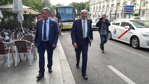 Revilla y Mazón han accedido al Patio del Congreso sobre las 9.40 horas, veinte minutos antes de que comience la sesión constitutiva de Cámara Baja en la XIII Legislatura, y en ese acceso el presidente cántabro ha hablado en directo para varias televisiones nacionales.