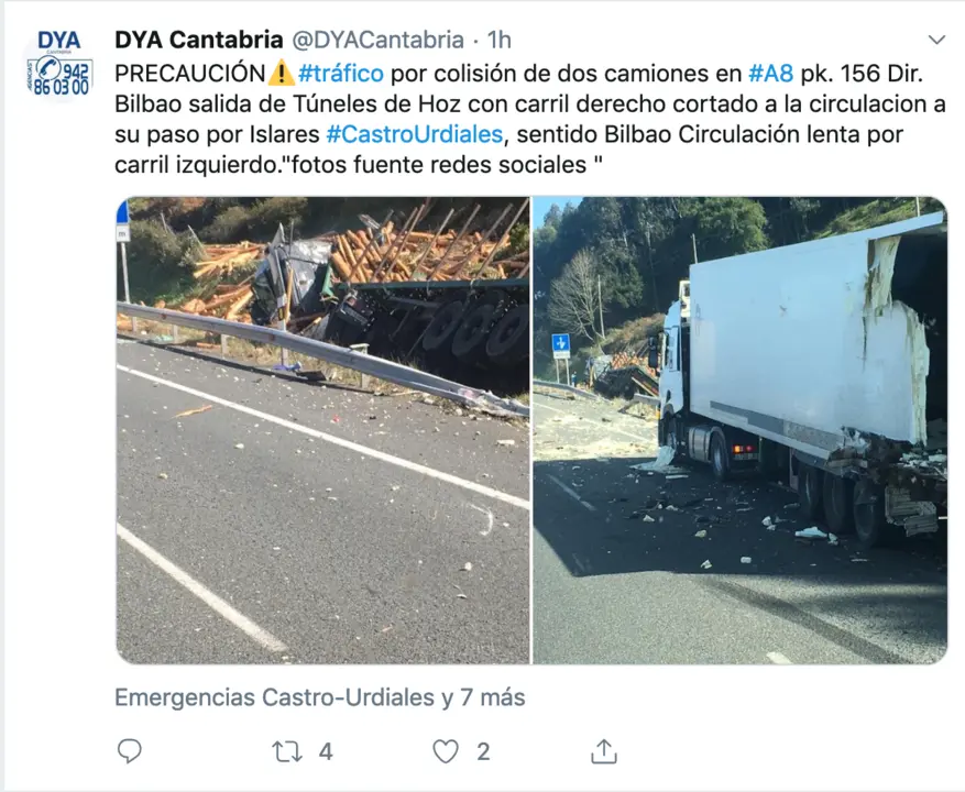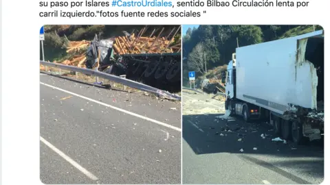 PRECAUCIÓN⚠️#tráfico por colisión de dos camiones en #A8 pk. 156 Dir. Bilbao salida de Túneles de Hoz con carril derecho cortado a la circulacion a su paso por Islares #CastroUrdiales, sentido Bilbao Circulación lenta por carril izquierdo."fotos fuente redes sociales " pic.twitter.com/FMIE5gXWEa