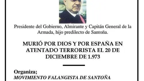 Un año más, Santoña celebrará este domingo día 15 el homenaje a Carrero Blanco (Santoña, 1904), quien fuera Presidente del Gobierno de España e hijo predilecto de la villa, asesinado por ETA el 20 de Diciembre de 1973.