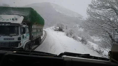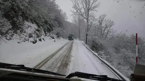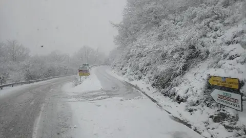 Las salidas de la comarca se indican por Piedrasluengas, puerto, que según 112 Cantabria, se encuentra con necesidad de uso de cadenas y que como se ve en la imagen de las 14:00horas, en este momento se encuentra 'casi' intransitable.