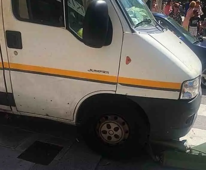 El vehículo de las imágenes, de la empresa que realiza las obras, estaba aparcado en la zona de marcada de obras, cuando derrepente, por fallo o falta de freno de mano, se ha desplazado entre la acera y la carretera a lo largo de la calle Lealtad, hasta impactar y derribar un semáforo de un paso de cebra, por suerte, sin causar daños personales a nadie.