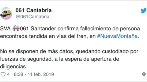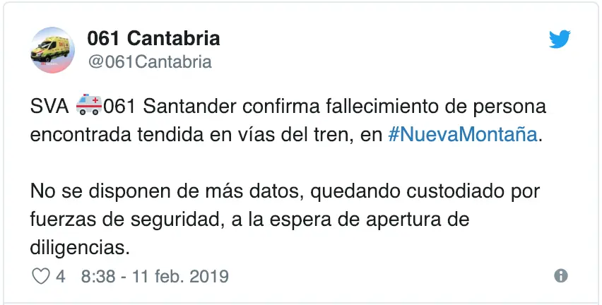 Así informaba 061 Cantabria: "SVA 061 Santander confirma fallecimiento de persona encontrada tendida en vías del tren, en #NuevaMontaña.