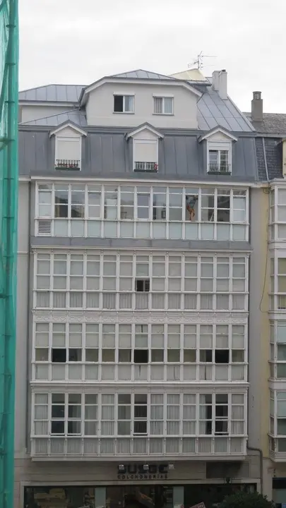 Calle San José de Santander, zona centro, domingo,... parece que la limpieza es importante en la capital cántabra, tras varios casos de mujeres limpiando sus cristales desde los polletes de las ventanas, ahora aparece él, desde un cuarto, limpiando así.
