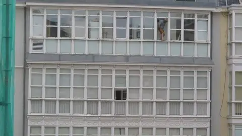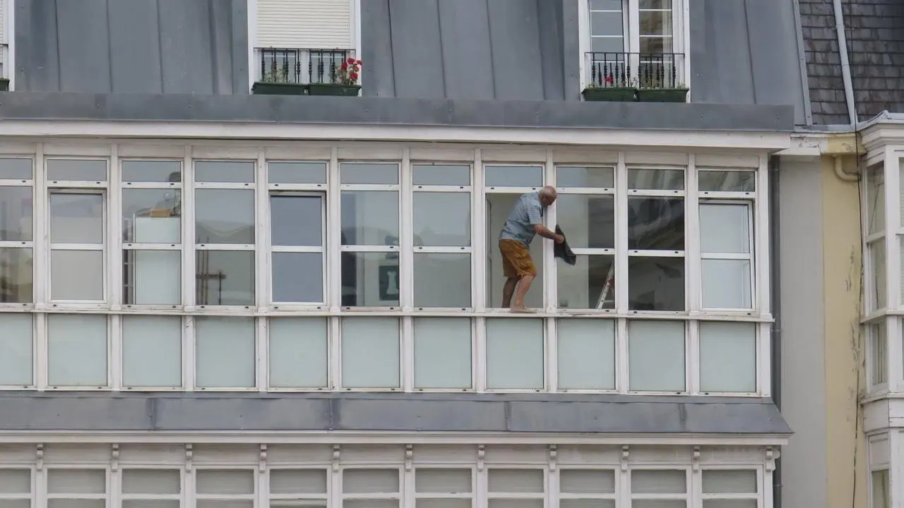 Un hombre limpia los cristales de esta manera desde un cuarto en Santander