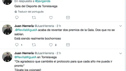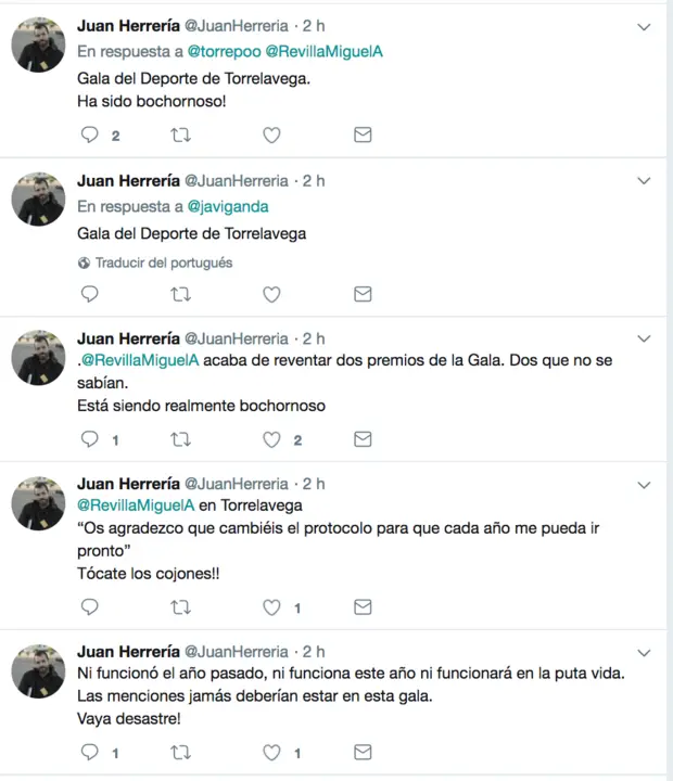 Otro aspecto que resalta Juan Herrería es la marcha temprana del Presidente Regional Miguel Ángel Revilla, que año tras año acude a saludar a los deportistas del Besaya pero no se queda durante todo el acto. - Revilla: "Os agradezco qe cambiéis el protocolo para que cada año me pueda ir pronto" a lo que el comentario era: "Tócate los cojones!!"