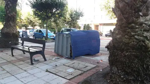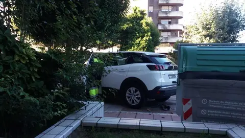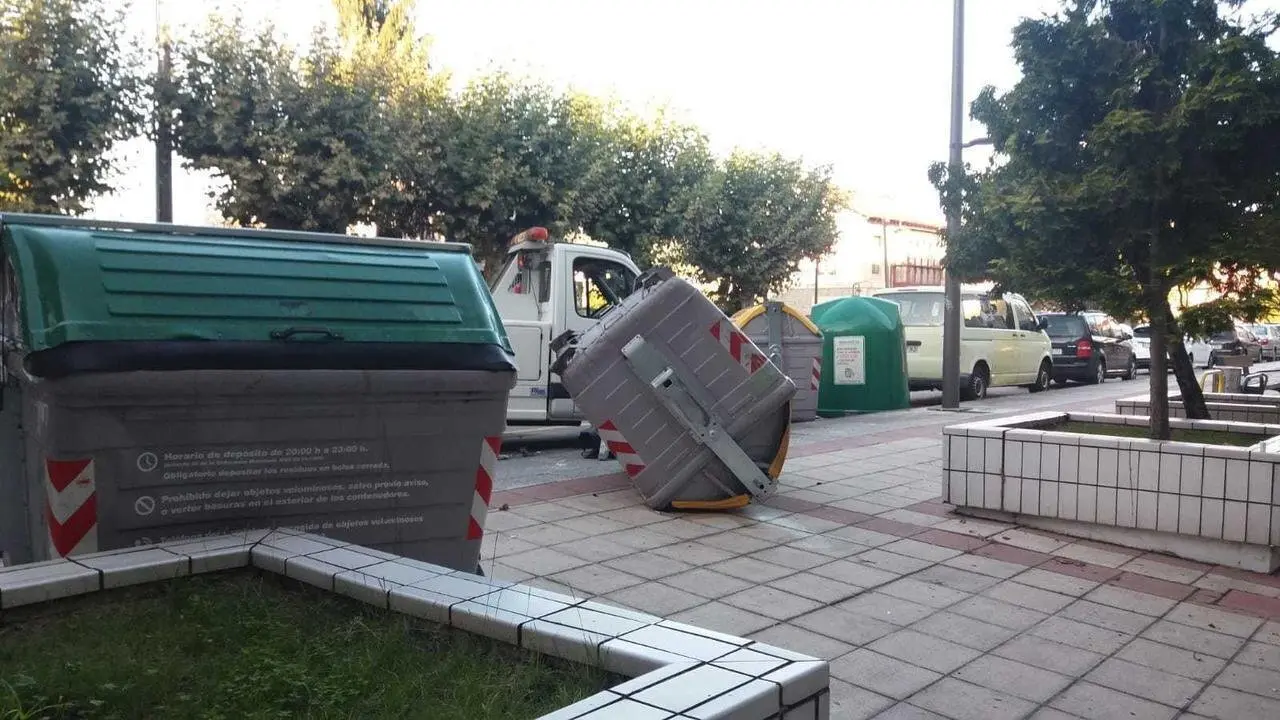 A primera hora de la mañana un vehículo que circulaba por la calle Julio Hauzeur de Torrelavega, a su paso por el Centro Comercial Altamira, perdía el control subiéndose a la acera en una zona donde se depositan cubos de basura.