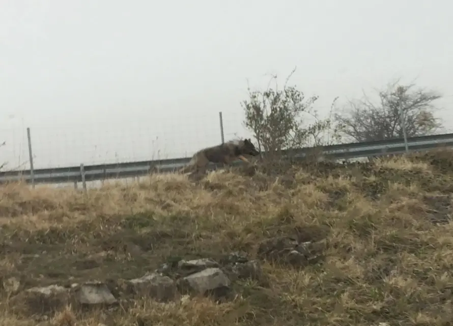 Circulaba nuestro amigo Jairo con su coche por la vía de servicio junto a Santiurde de Reinosa, aneja a la autovía A-67, cuando se le cruzó por delante, primero le sorprendió, pensó que un perro, pero no, un lobo, a plena luz del día y a escasos metros de las viviendas. Guardia Civil de Tráfico esta en el lugar dado que el animal intentó cruzar la autovía, en la segunda imagen y en el video se puede ver el vehículo policial, a los agentes con las armas en la mano y el lobo en el alto, si baja va directo a la autovía.