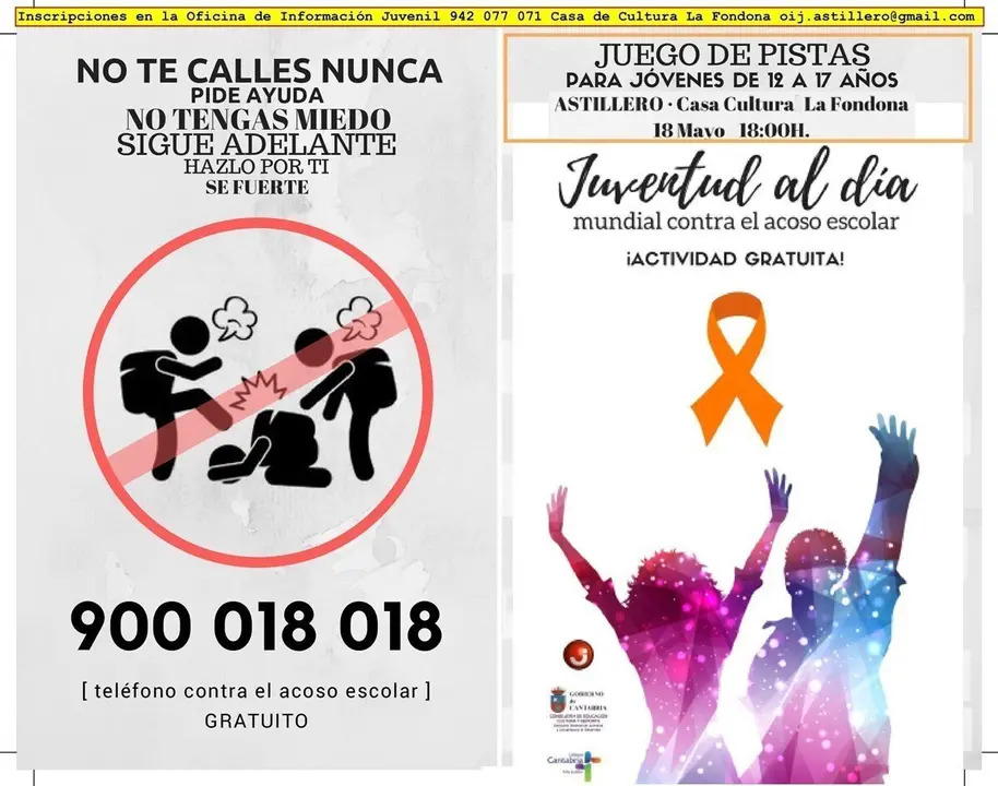 La Concejalía de Cultura, a través de la Oficina de Información Juvenil, ha organizado este viernes 18 una yincana de 'juego de pistas' contra el acoso escolar para jóvenes entre 12 y 17 años. El juego tendrá lugar en la Casa de Cultura La Fondona y sus alrededores a partir de las 18.00 horas y la participación es gratuita.