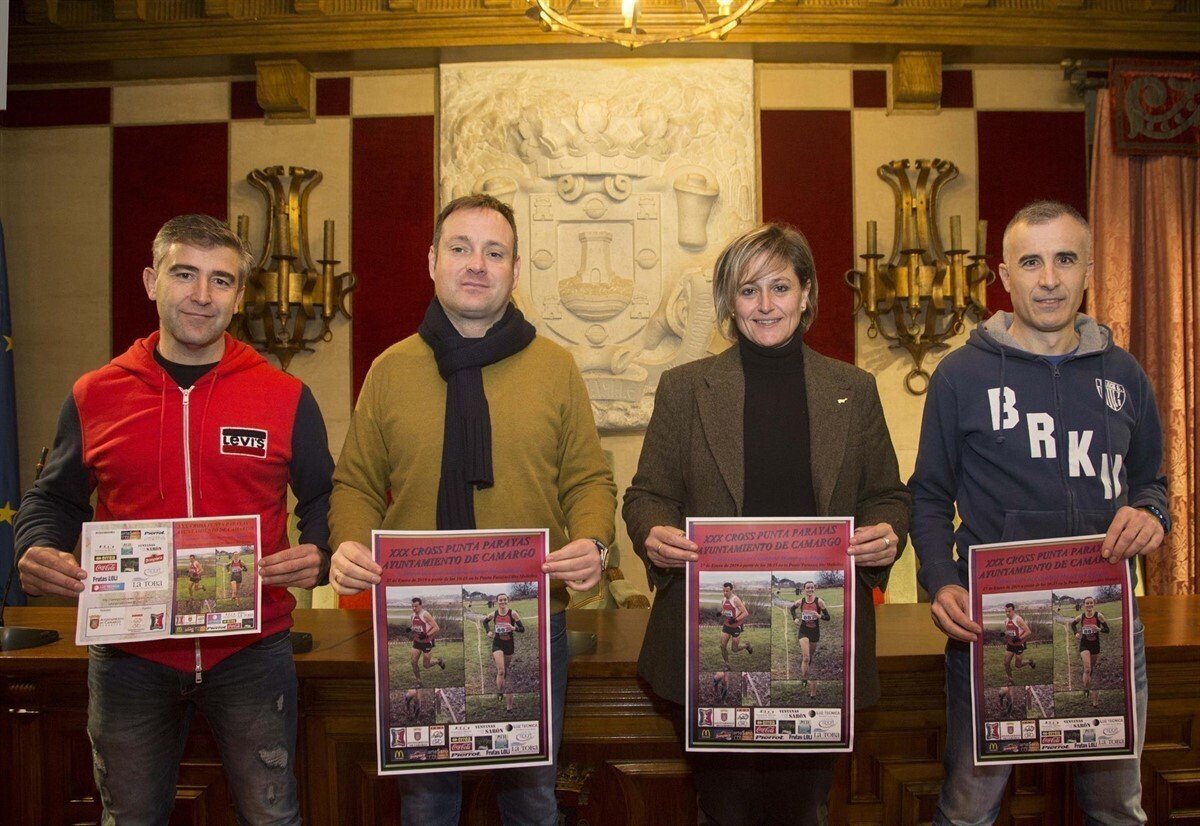 La alcaldesa de Camargo, Esther Bolado, y el concejal de Deportes, Gonzalo Rodeño, acompañados por los representantes del Camargo Ría del Carmen, Javier García Bengoechea y Miguel Ángel Santa Cruz, han presentado el cartel de la prueba y han animado a los aficionados al atletismo a acudir a Punta Parayas el domingo a disfrutar de este cross.