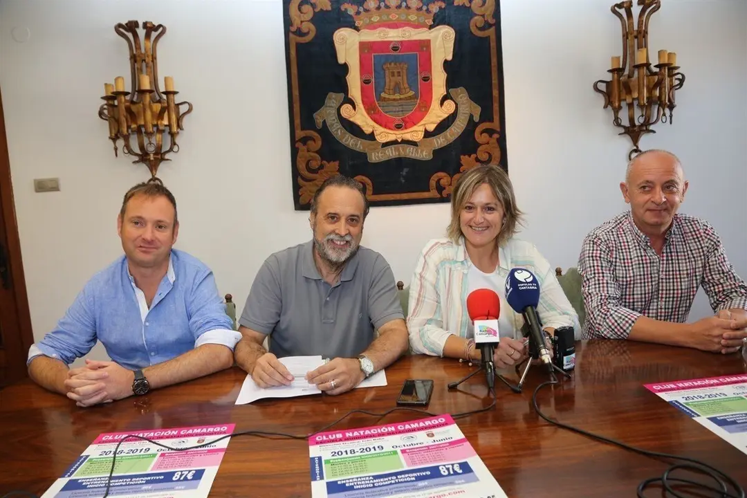 La alcaldesa de Camargo, Esther Bolado, el concejal de Deportes, Gonzalo Rodeño, el presidente de la Federación Cántabra de Natación, Jesús Báscones, y el presidente del CN Camargo, Jesús Herrán, han presentado hoy en rueda de prensa las medidas introducidas a partir de esta temporada en la que se amplían las opciones que disponen las familias.