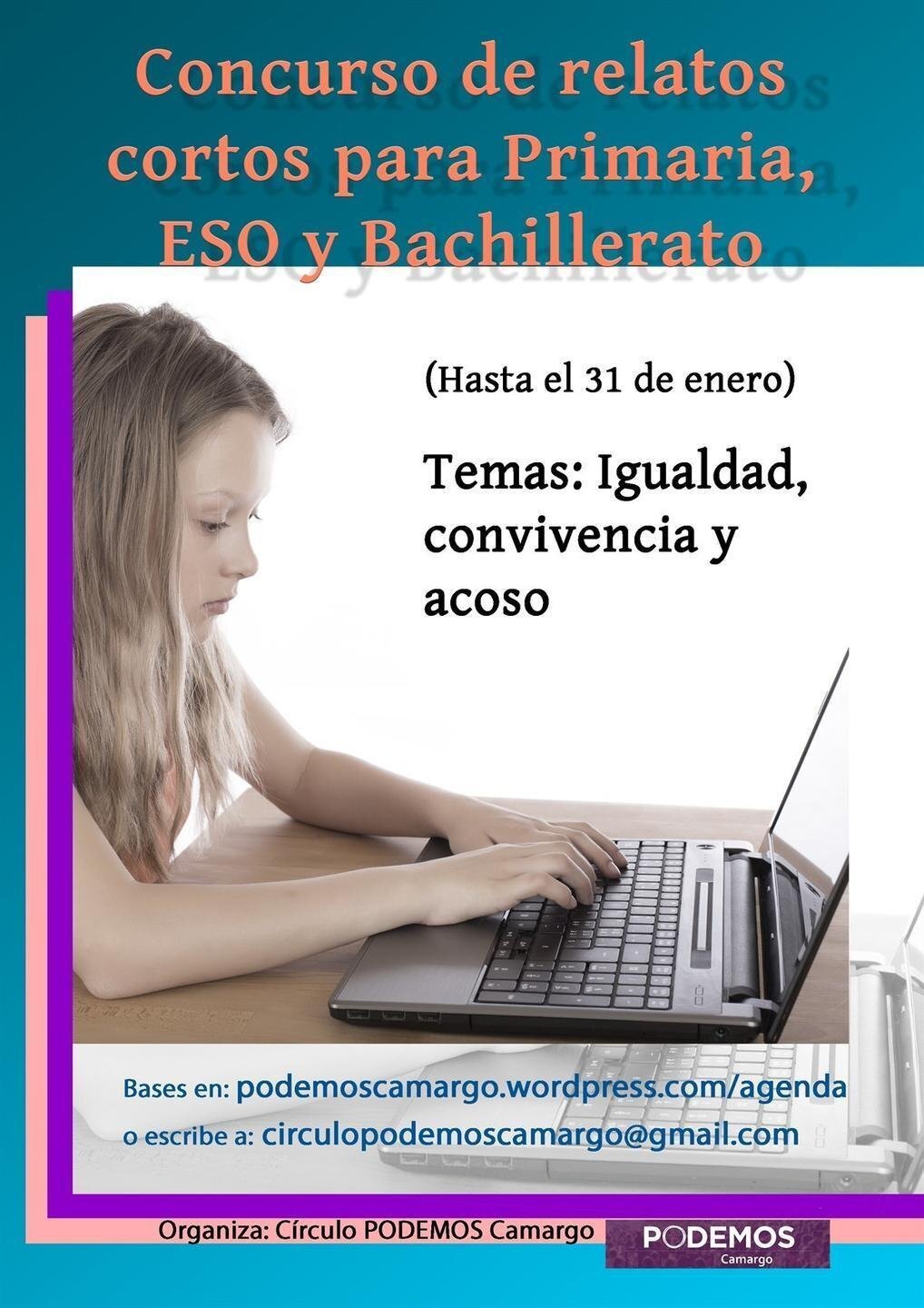 Podemos Camargo ha organizado un concurso de relatos cortos sobre igualdad, convivencia y acoso dirigido a estudiantes de Primaria, Secundaria y Bachillerato de los centros educativos del municipio.