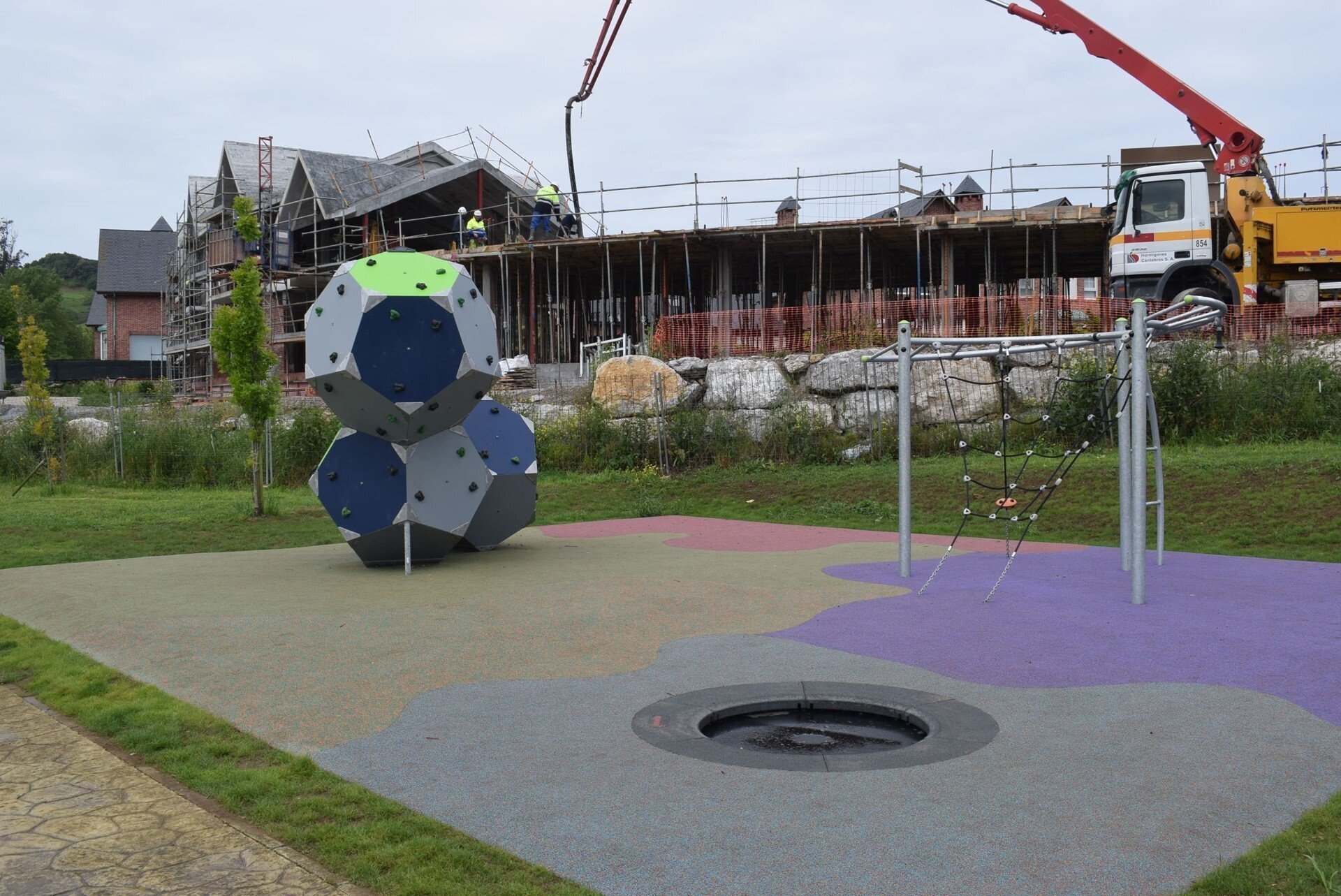 El parque está equipado con tres tipos de aparatos: bloques de escalada de forma geométrica; un jumper redondo, una versión mejorada de la cama elástica a nivel de suelo, totalmente accesible, y un escalador que ofrece una gran variedad de opciones para trepar.
