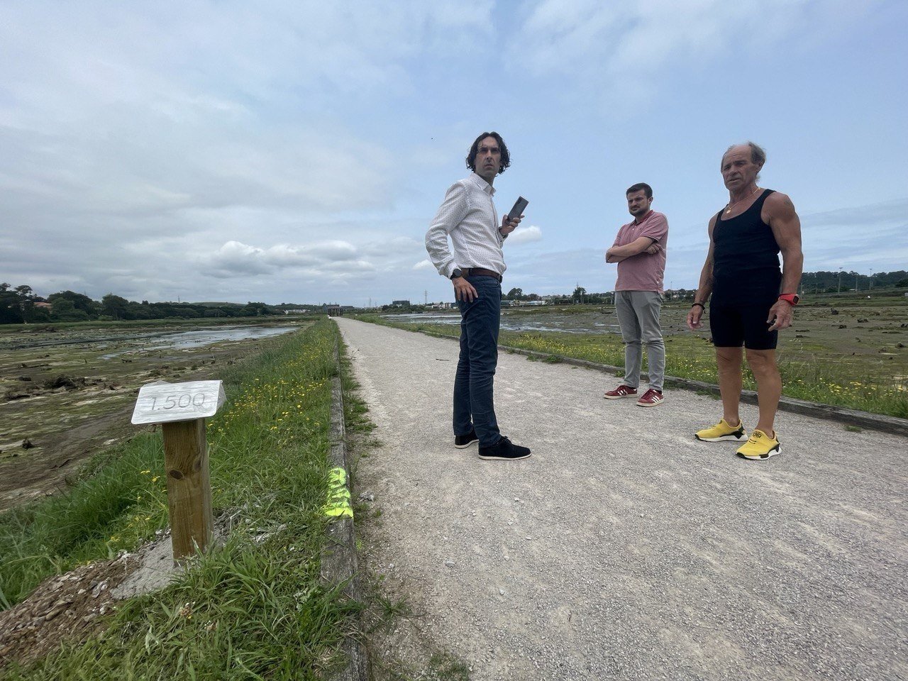 El alcalde de Astillero, Javier Fernández Soberón, y el concejal de Deportes, Alejandro Hoz, han visitado la zona donde se están realizando los trabajos de instalación de las señalizaciones. Junto a ellos ha estado Gonzalo García, presidente del Club de Atletismo Guaramako, precursor de esta iniciativa de marcaje de metros.