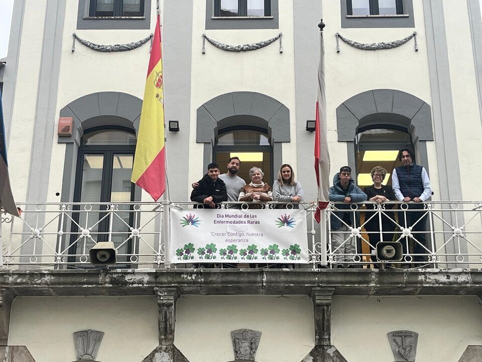 Durante el acto, los representantes municipales y de las asociaciones han colocado la pancarta conmemorativa en el balcón consistorial con el objetivo de visibilizar y concienciar sobre las Enfermedades Raras.
