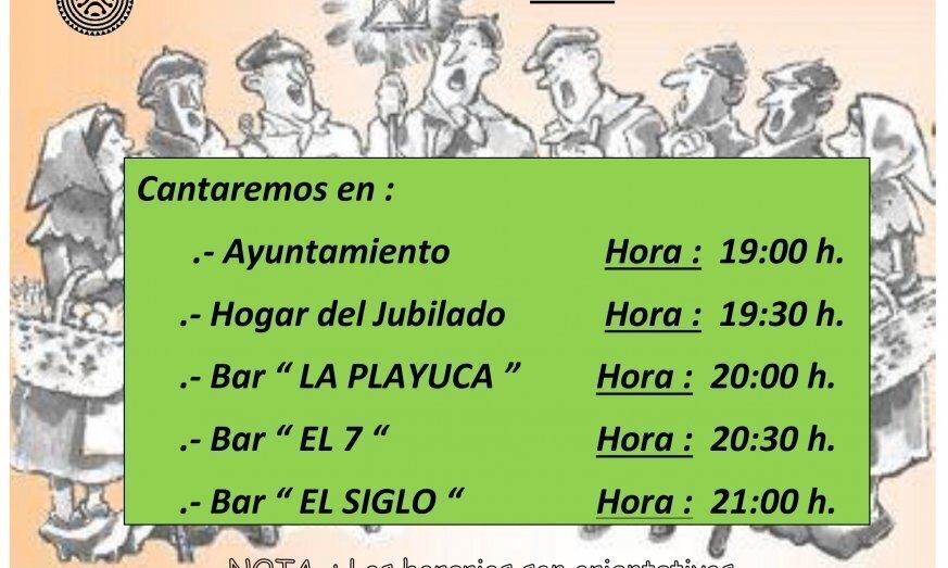 Sobre las 19.30 horas la ronda marcera llega al Hogar del Jubilado y la parada en el bar 'La Playuca' será en torno a las 20.00 horas. La Escuela llegará al bar 'El 7' sobre las 20.30 horas; para finalizar el recorrido en el bar 'El siglo' en torno a las 21.00 horas, siempre con horarios orientativos.