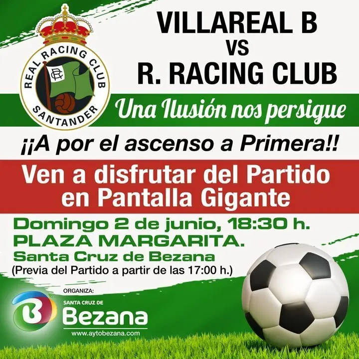 El Ayuntamiento de Santa Cruz de Bezana instalará este domingo una plantalla gigante en el plaza Margarita para que los seguidores y aficionados al Real Racing Club puedan seguir en directo el partido que los verdiblancos disputarán contra el Villarreal B en el estadio de La Cerámica.