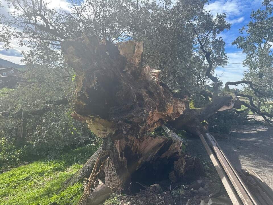 La encina centenaria de San Julián en Zurita (Piélagos), incluida en el Catálogo de Árboles Singulares de Cantabria en abril de 2023, se ha caído este viernes, posiblemente debido a los fuertes vientos del temporal que esta misma semana azotó la región, unido a la podredumbre que evidencia su tronco.