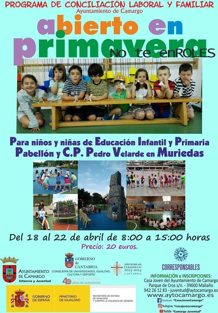 La Concejalía de Infancia y juventud del Ayuntamiento de Camargo abrirá este viernes, 25 de marzo, el plazo de inscripciones para participar en el programa de conciliación laboral y familiar 'Abierto en Primavera', dirigido a niños de educación Infantil y Primaria, que se celebrará del 18 al 22 de abril en horario de 8.00 a 15.00 horas.