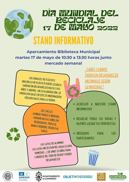 La Escuela de Medio Ambiente del Ayuntamiento de Camargo se sumará el próximo 17 de mayo a la celebración del Día Internacional del Reciclaje con una carpa informativa situada en el aparcamiento de Cros, donde se realizarán actividades de sensibilización sobre la necesidad de realizar un consumo responsable y una correcta separación de los residuos.