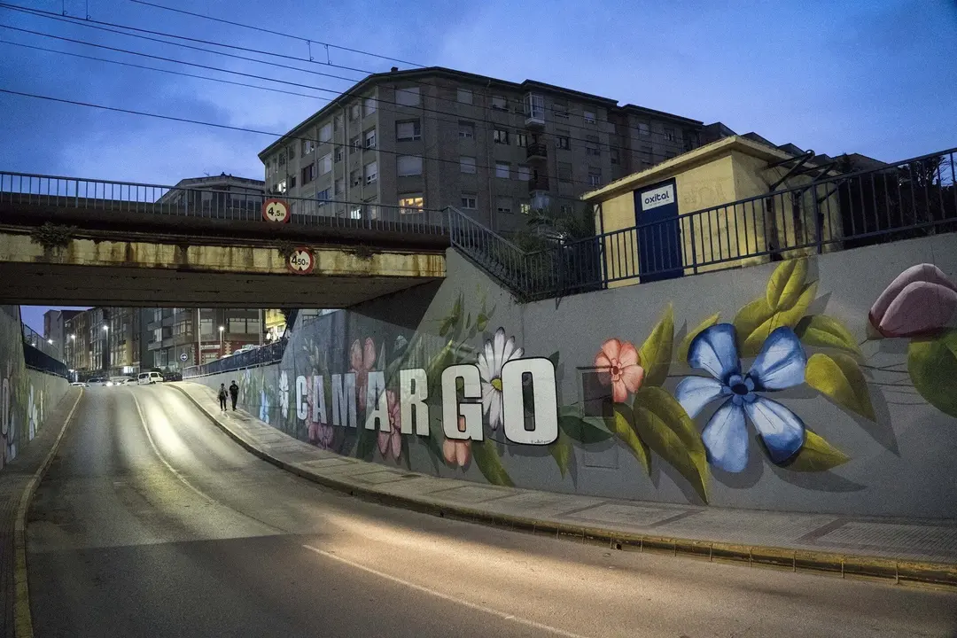 El artista Aarón Diego del colectivo Wallart ha sido el encargado de diseñar el mural, que cuenta con unos motivos vegetales con flores y hojas que se entremezclan para acompañar las dos partes que componen la obra, con una zona donde se pueda leer 'Camargo' y en la otra 'Contigo'.