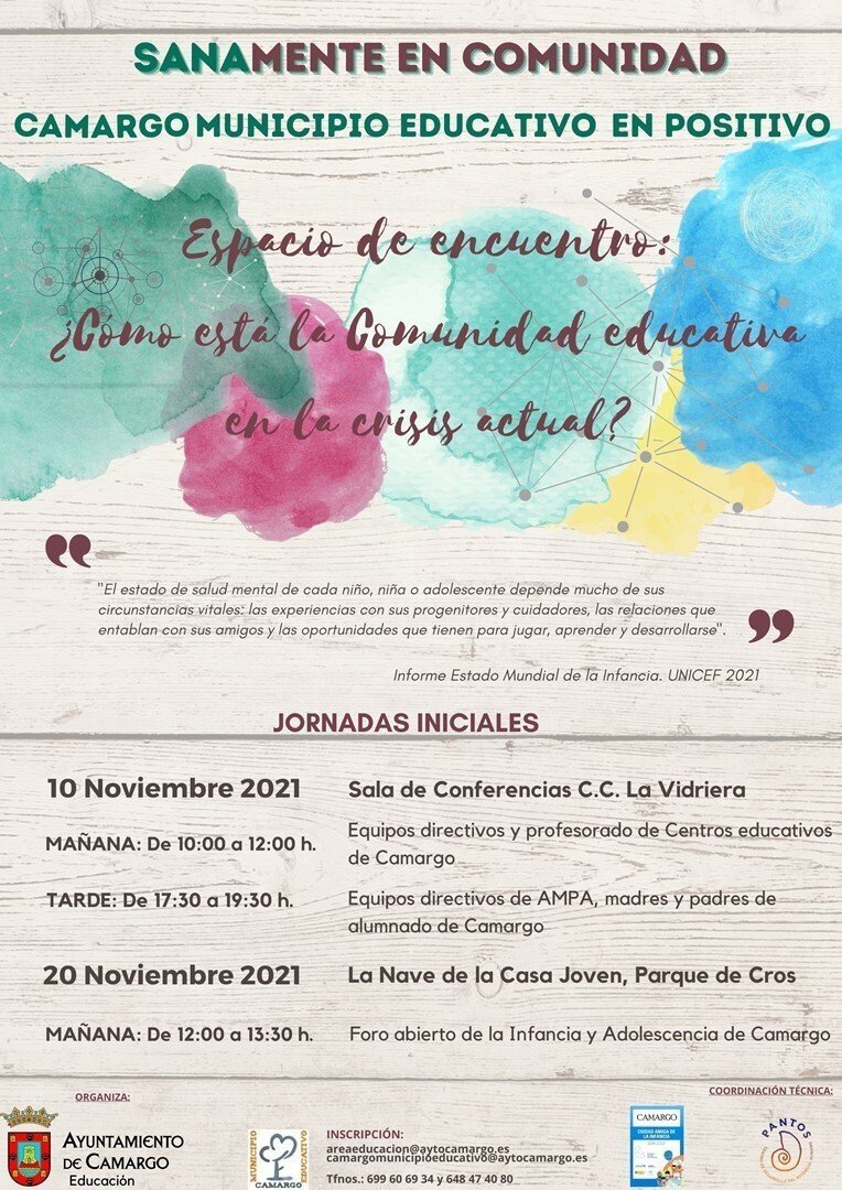 El Ayuntamiento de Camargo celebrará los días 10 y 20 de noviembre las primeras jornadas del nuevo programa 'Sanamente en comunidad. Camargo municipio educativo en positivo', que se va a poner en marcha con el objetivo de crear espacios de encuentro y participación social de la comunidad educativa, destinados al análisis, reflexión y comprensión de las claves de la crisis derivada del impacto de la pandemia del Covid.