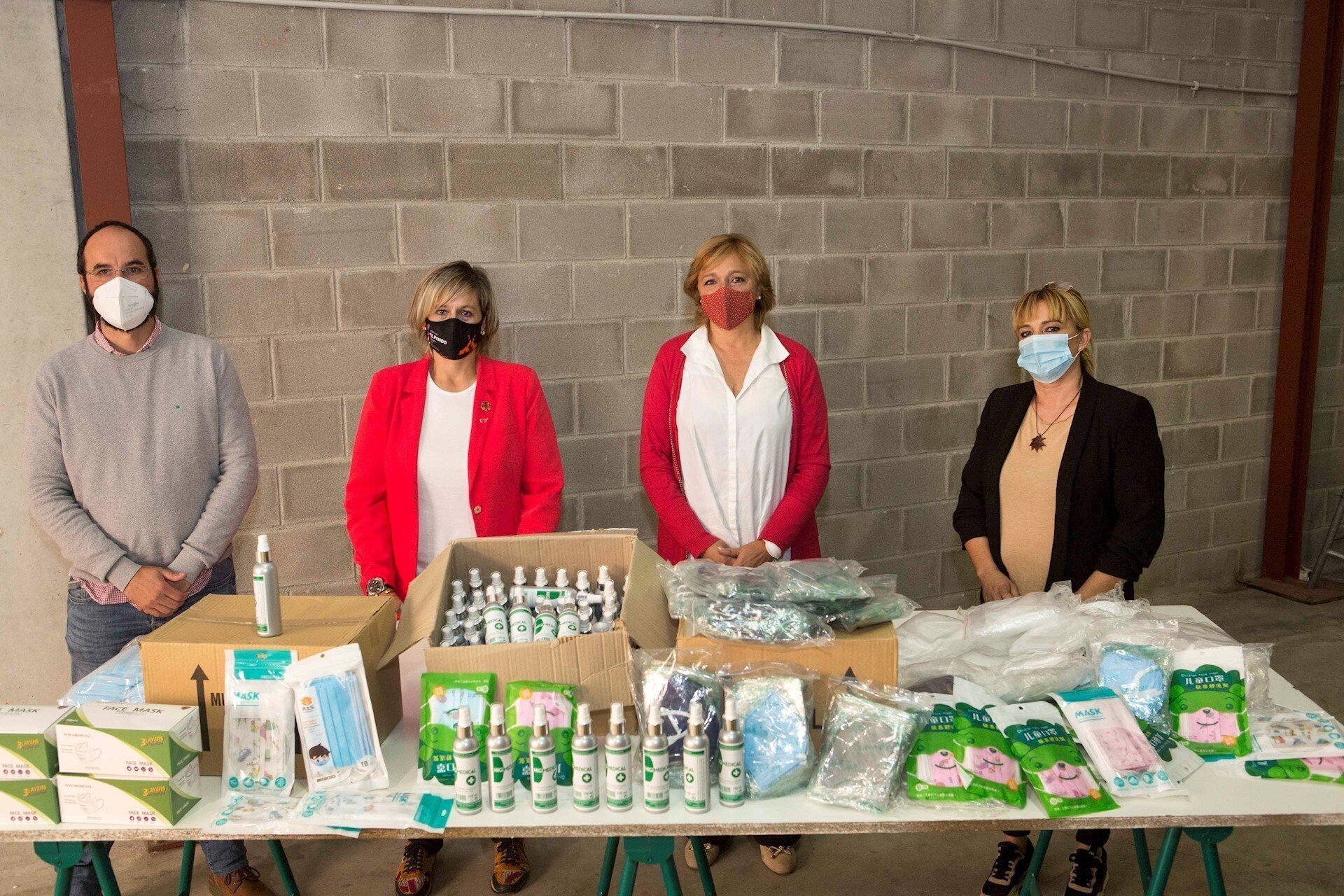 La alcaldesa de Camargo, Esther Bolado, acompañada por el concejal de Personal, Íñigo Gómez; la concejala de Mayores, Marián Vía; y la gerente de la compañía, Elisa Alonsotegui, ha asistido a la entrega de estos lotes de productos, que están integrados por 2.820 unidades de mascarillas para niños y adultos, así como 219 botes de gel para la limpieza de manos.