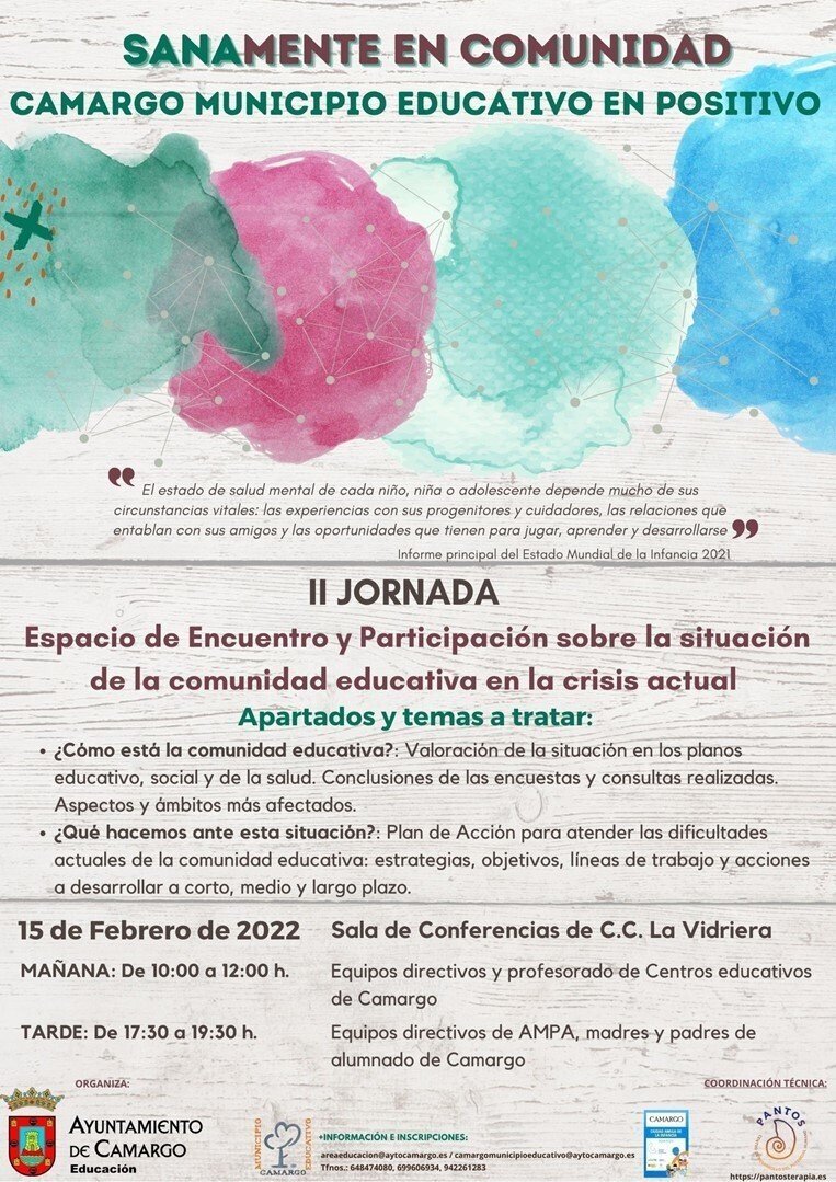 La Concejalía de Educación del Ayuntamiento de Camargo celebrará este mes de febrero una nueva jornada del programa 'Sanamente en comunidad' con el objetivo de seguir analizando el impacto que está teniendo la pandemia del Covid en la comunidad educativa y ayudar a desarrollar acciones para atender las necesidades surgidas.