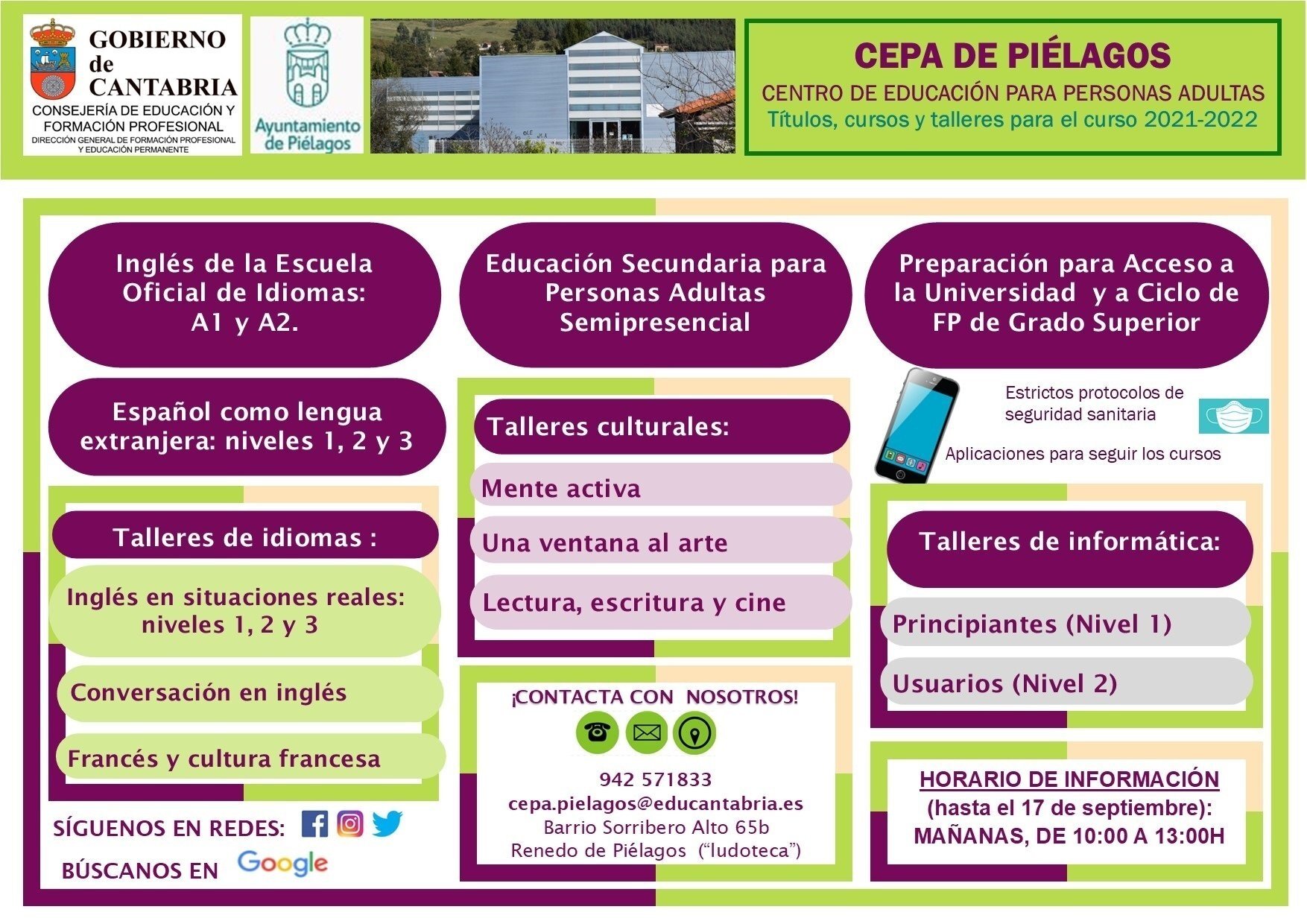 El Centro de Educación de Personas Adultas (CEPA) de Piélagos ha abierto la matrícula para las distintas enseñanzas que impartirá durante el curso escolar 2021-2022.