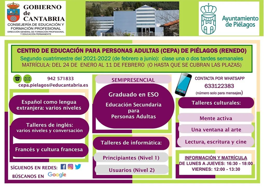 El Centro de Educación de Personas Adultas (CEPA) de Piélagos abrirá la próxima semana el plazo de matrícula de los cursos y talleres que impartirá durante el segundo cuatrimestre del curso 2021-2022.